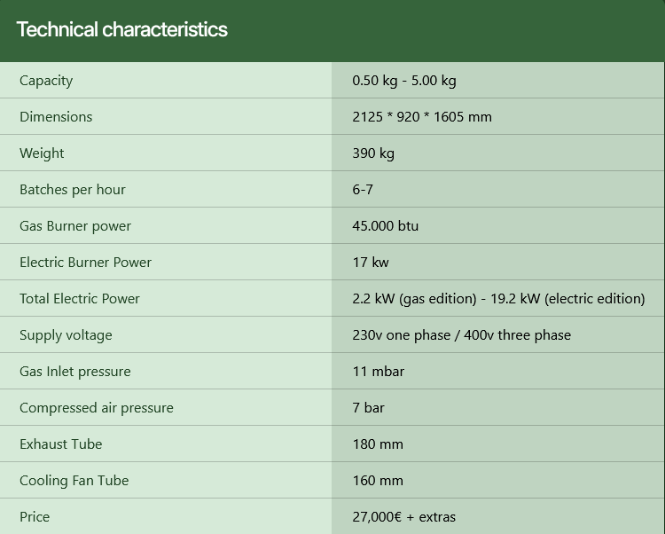 Opis: IRM 3 łączy w sobie palenie próbek z pełną produkcją. Dzięki wydajności wsadu od 0,50 g do 5,0 kg, oferuje idealną równowagę między rozmiarem, mocą i elastycznością — idealną dla małych palarni, które chcą skalować produkcję bez utraty jakości i kontroli.