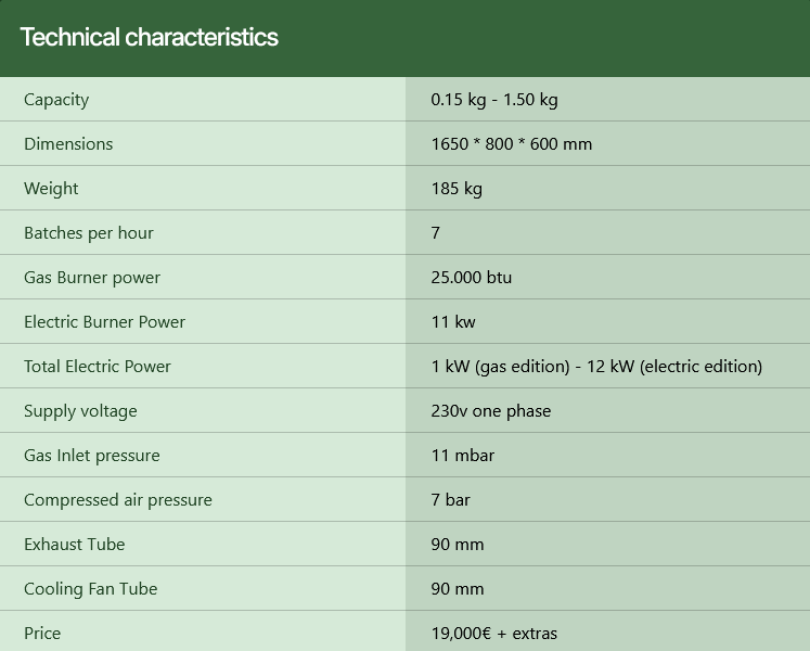 Opis: Pierwszy na świecie przemysłowy, stołowy palacz kawy. Zaprojektowany z myślą o bezkompromisowej jakości palenia kawy na małą skalę, IRM Micro zapewnia pełną wydajność IRM w kompaktowej obudowie — idealny dla laboratoriów, mikro-palarni i wizjonerów, którzy palą kawę z pasją.